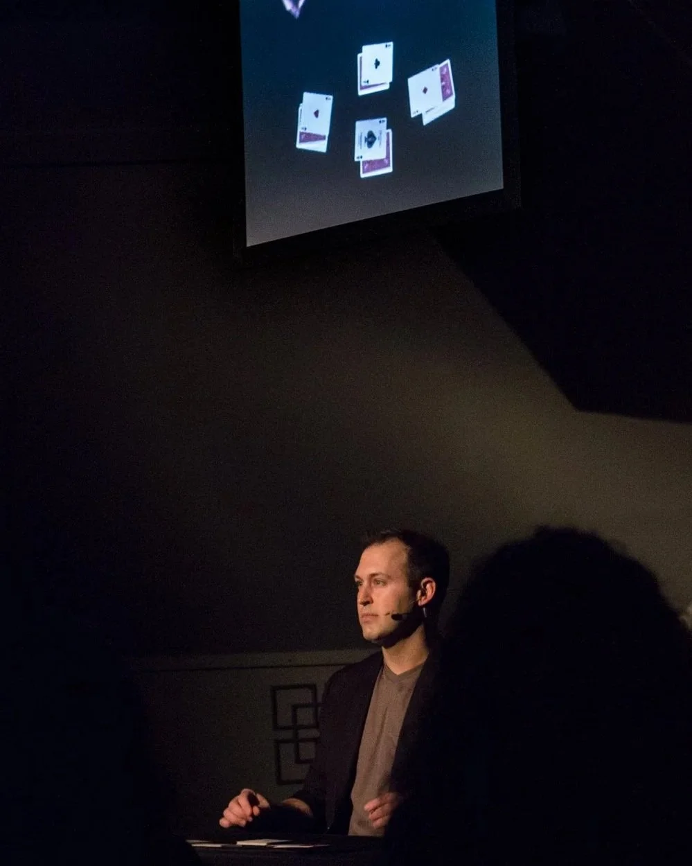 A magician (Jason Michaels) captivates the audience on a dramatically lit stage, showcasing impressive sleight-of-hand card tricks. The performance is a blend of skill and artistry, embodying the essence of live entertainment, while subtly reminding viewers of the complexities of neurological disorders, such as Tourette syndrome, that can affect social interactions and daily life.