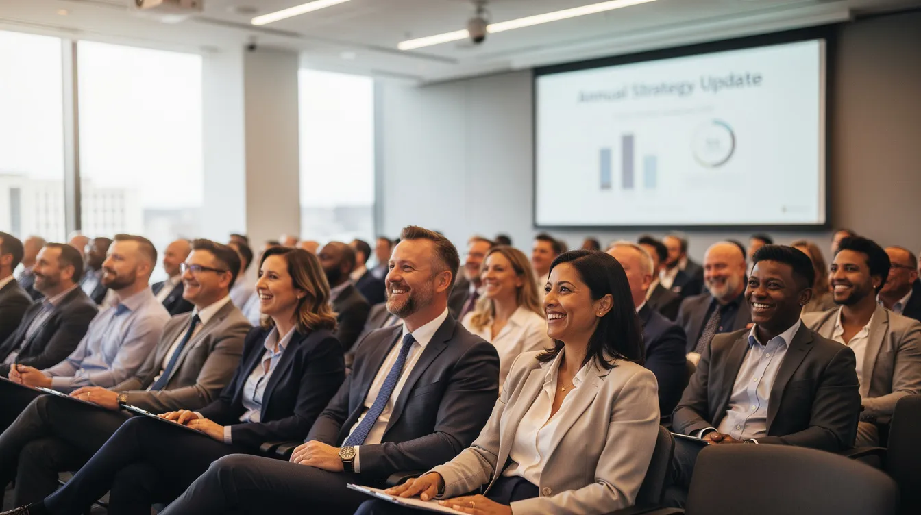 The image shows a diverse corporate audience, engaged and smiling during a presentation, highlighting their active participation and positive energy. This scene reflects the importance of social skills and maintaining social relationships in a professional setting, which can be particularly significant for individuals with tic disorders or other neurological disorders.