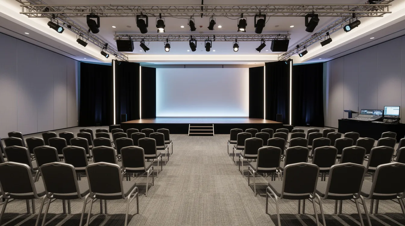 A professional corporate event venue with stage lighting and conference seating.
