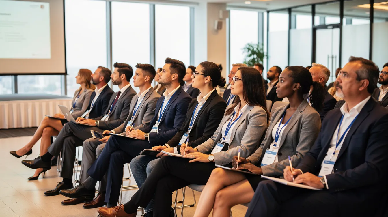 A diverse group of business professionals is attentively watching a finance keynote speaker at a corporate conference, eager to gain insights into financial planning and money management. The atmosphere is filled with a sense of empowerment as attendees seek to achieve their financial goals through knowledge and expertise.